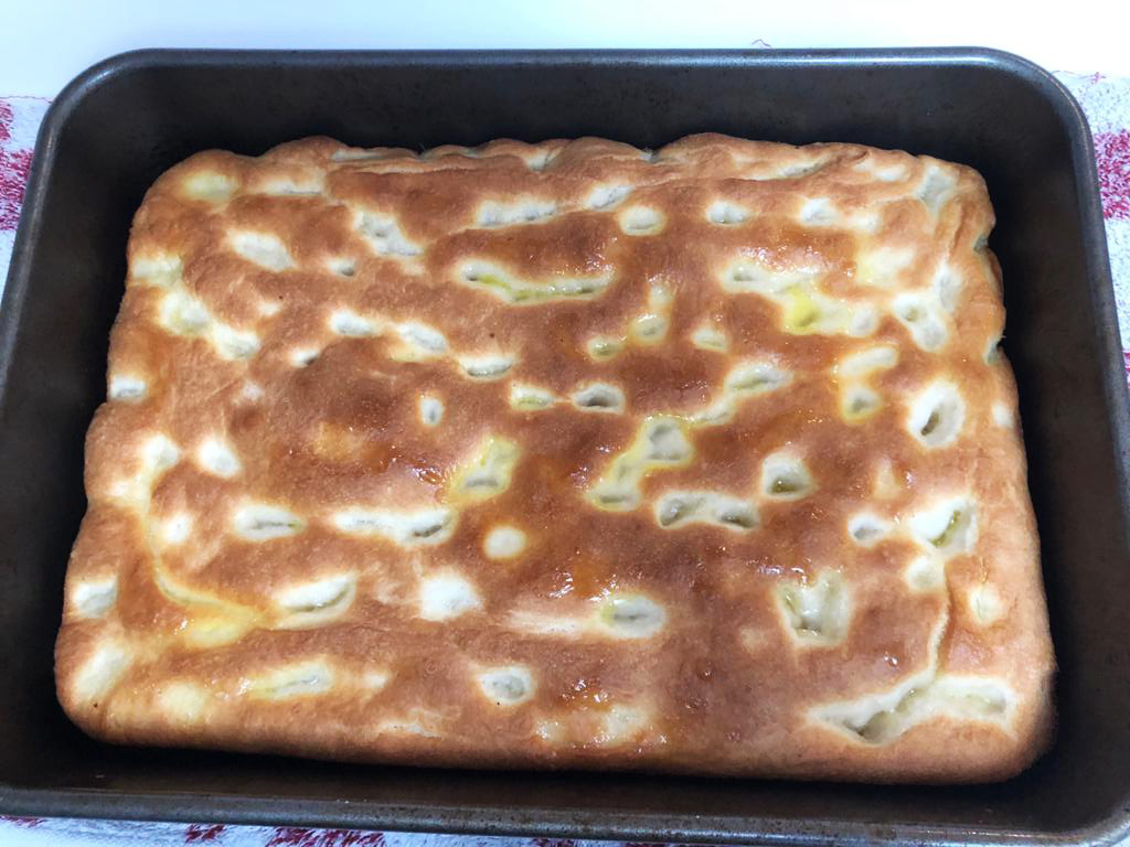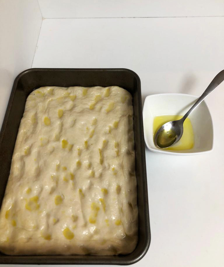 We leave our dough to rise for about 30 minutes, and then after we lay the dough in a well-oiled pan; I spread over the brine and create the dimples using the fingers of my left hand (I am left-handed 🙂 ).