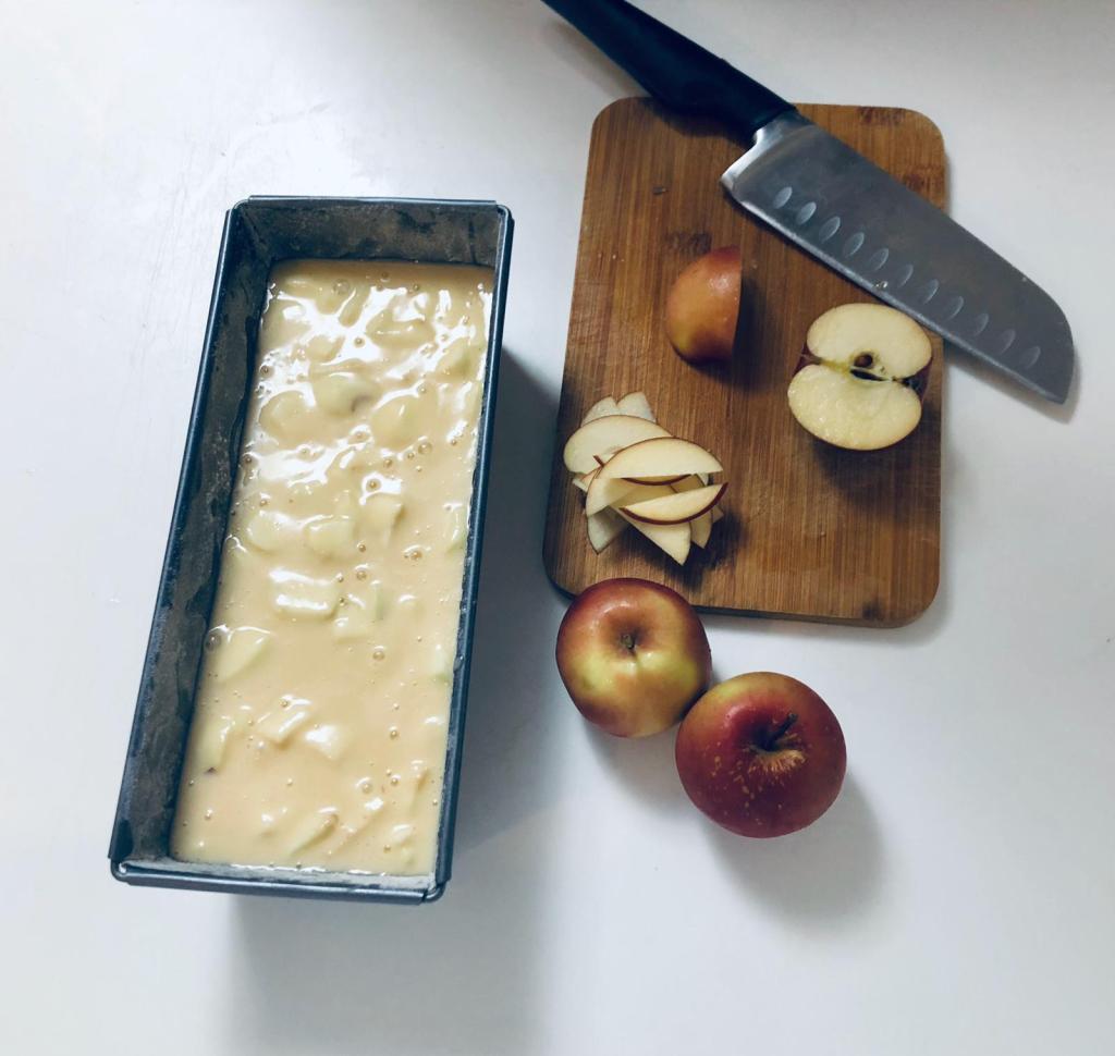 Dopo aver lavato le mele, le taglio a dadini, orientativamente 1 cm X 1 cm, (ma non stiamo costruendo una casa. La precisone ci piace ma dobbiamo anche divertirci!) Io preferisco tenere la buccia, nella quale risiedono la maggior parte dei nutrientie e che conferisce alla torta un tocco di acidità in piu che mi piace tanto. Lascio i cubetti di mela in acqua e limone per evitare che si ossidano. In una bowl setaccio farina, fecola e lievito . Sale e cannella li lavoro con il burro morbido e lo zucchero. Una volta iniziato a lavorare il composto (con la foglia se sto usando la planetaria) aggiungo le uova. Quando il composto risuta omogeneo unisco le mele a cubetti (scolate e asciugate) e le polveri. Lavoro il composto con una spatola fin quando non è tutto amalgamato e lo verso nello stampo che ho già imburrato e infarinato. (io in questo caso ho scelto lo stampo da plum cake).