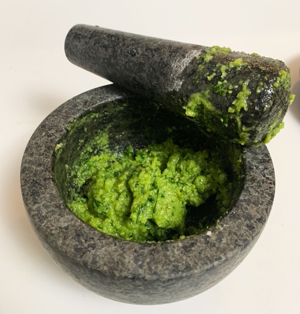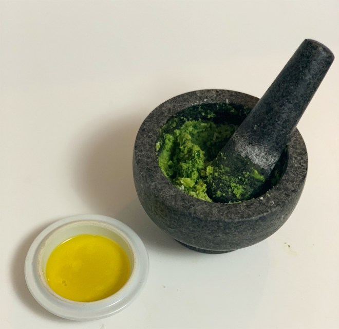 Let’s start by pick the basil, washing the leaves and drying them as soon as we can, otherwise the water will have an advers effect on the basil. I start pounding garlic, pine nuts and a pinch of salt, until they are creamy. Then I add the basil leaves and keep pounding it.
