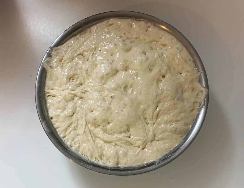 Questo impasto nello specifico ha bisogno di un tempo di riposo che va da un minimo di 8 ore ad un massimo di 24. Dunque organizzarsi non è difficile: si impasta la mattina e il giorno dopo è pronto da cuocere . Trascorso il tempo di attesa, l’impasto dovrebbe risultare cosi.