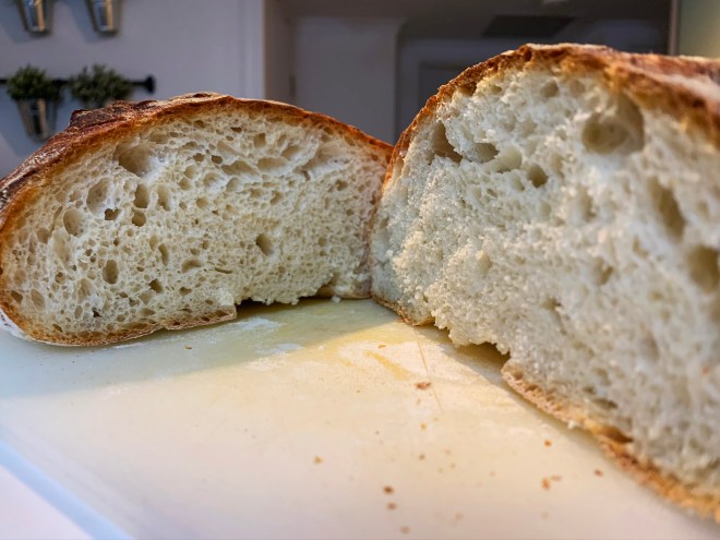 Al suono dell’ultimo timer che mi ricorda che son passati gli ultimi 45 minuti dalla quarta piega, finalmente, accendo il forno a 230 gradi. Sul livello più basso ripongo una piccola teglia con dell’acqua. E’ il vapore creato che formera’ la crosta al mio pane.  20 minuti con forno statico più altri 15 a 220 gradi e il mio pane è cotto.