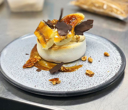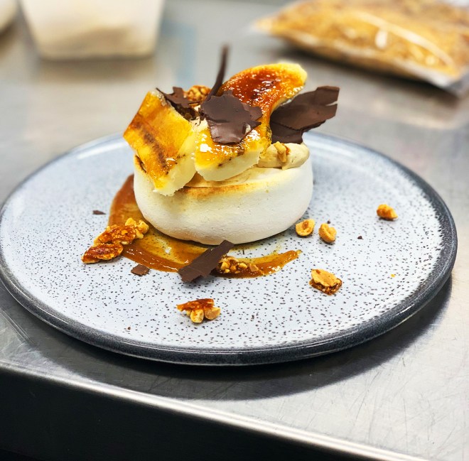 Once the caramel has been made, add the banana mix and stir well. Cook for another minute and cool completely before use it. For the bruléed bananas, peel one banana and halve it lengthways then place on a tray lined with foil. Scatter over the caster sugar then use a blowtorch to scorch the top. Set aside to cool and Enjoy!