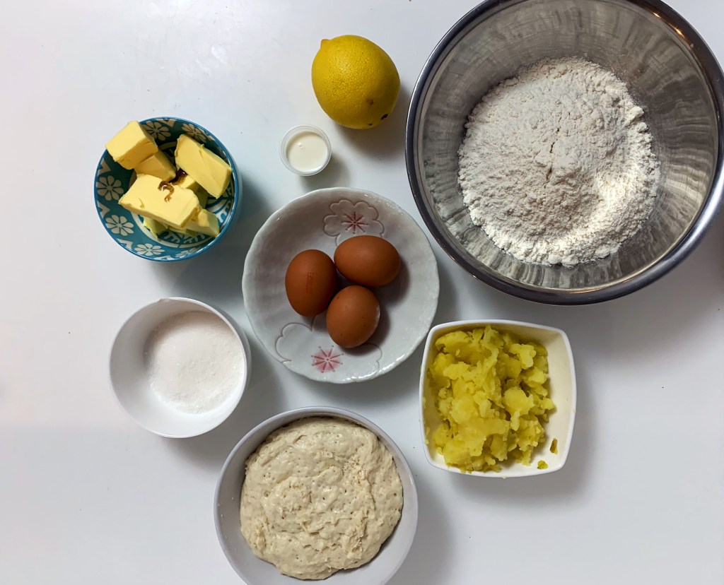 In una ciotola lavoro le patate, la farina, lo zucchero e le uova e gli aromi. Impasto e aggiungo il lievitino. Lavoro il composto per 5 minuti fino ad ottenere una bella incordatura. Dopo di che aggiungo il burro cemoso e continuo ad impastare per 10 minuti. Ovviamente se avete un robot da cucina o planetaria i tempi si abbreviano. Come ho gia mostrato per altri lievitati, la consistenza dovrà essere liscia e non appiccicosa, dunque lascio riposare in una ciotola coperta con pellicola o un canovaccio per 2 ore a temperatura ambiente.