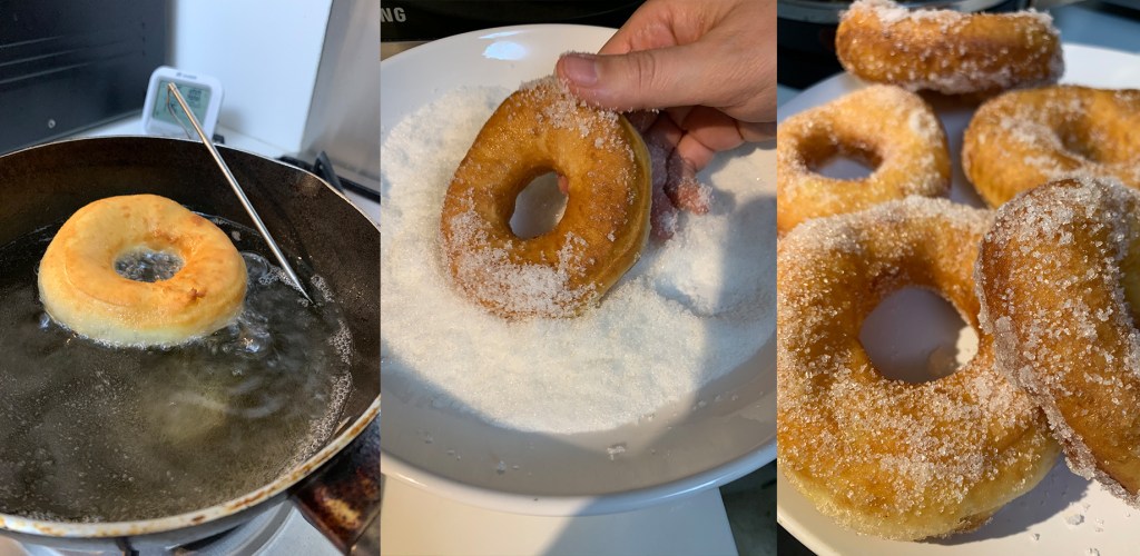 trascorsi i quali vanno appoggiate su carta assorbente per qualche instante e poi tuffate e rotolate nello zucchero semolato. Per dare una nota originale alle ciambelle, allo zucchero può essere aggiunta della cannella o delle zeste di limone.