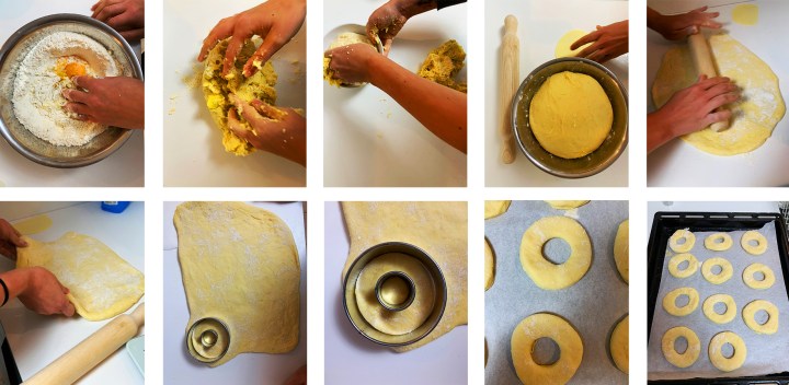 B) the doughnuts: flatten a little the ball, then create a hole in the center with your finger. Finally, enlarge the hole shaping a doughnut.