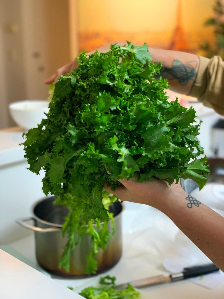 La prima cosa che faccio, dopo aver accuratamente lavato la mia scarola, e’ darle una prima cottura in una casseruola bella grande in modo da farle perdere l’acqua in eccesso. Ci vorranno 5 minuti girando di tanto in tanto. In una padella molto capiente faccio soffriggere l’aglio, il peperoncino e le acciughe che ho già tritato. Lascio insaporore e aggiungo le olive, i ponoli e l’uvetta ed infne la scarola con una parte dell’acqua di cottura. Lascio cuocere in padella a fiamma moderata per 5 minuti e aggiusto di sale e pepe, senza esagerare, ricordatevi che ci sono già capperi ed acciughe! Credetemi c‘è un profumo in casa davvero invitante. Terminata la cottura della scarola la lascio raffreddare.