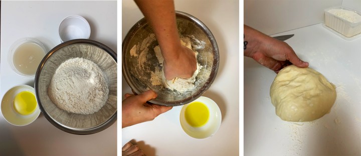L’impasto è la prima cosa che vado a realizzare perchè avrà bisogno di lievitare per almeno 4 ore. Sciolgo il lievito nell’acqua con lo zucchero e lascio riposare per 5 minuti. Aggiungo il sale alla farina, quindi l‘acqua con il lievito e lo zucchero e impasto per 10 minuti, trascorsi i quali aggiungo l’olio e lavoro fino ad ottenere il solito panetto liscio ed elastico. Lascio riposare in una ciotola che coprirò con della pellicola per 4 ore a temperatura ambiente.