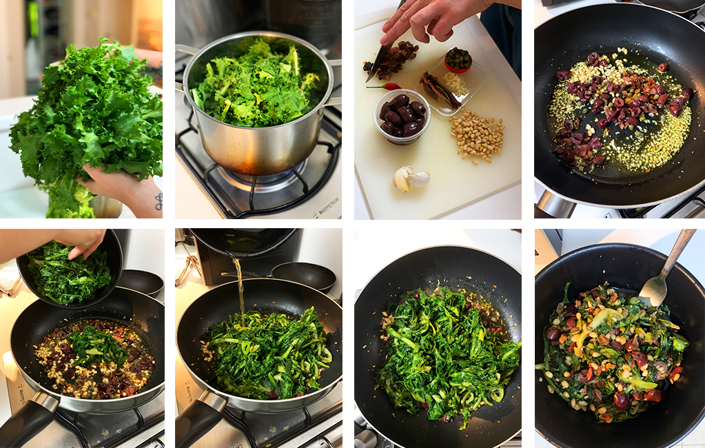 First thing I do is to remove the leaves from the escarole heads, discarding any bruised or damaged portions and place in a sink or large bowl of cool water to wash away any signs of soil. Rinse well and remove to a large colander. Bit by bit I chop the escarole leaves into strips and then cut across the midsection to create smaller pieces. Set aside on a clean cotton kitchen towel. Meanwhile, heat olive oil in a large frying pan over high heat. Once the oil is hot I add the minced garlic, the chili and the anchovies. Reduce the heat and cook until nicely golden, stirring as necessary. Now add remaining ingredients: black olives, pine nuts, capers and raisins. and cook for several minutes insuring that it does not burn. Add curly endive and stir occasionally until wilted (1 minute). Reduce heat to low and cook, covered, for flavours to infuse (5-10 minutes). Season the mixture with salt and freshly ground black pepper and strain through a sieve to remove excess liquid, cool completely.