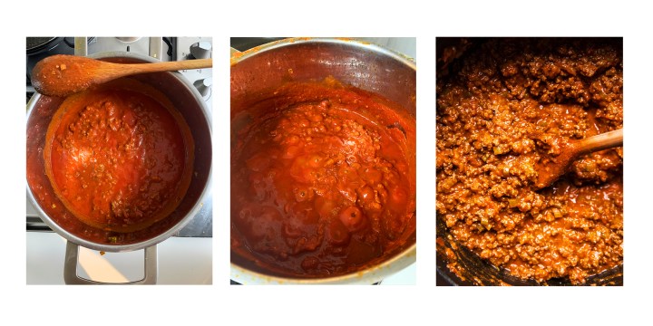 A questo punto unite la passata di pomodoro, mescolando con un cucchiaio per amalgamare. Portate a bollore, coprite, senza sigillare con il coperchio, e cuocete a fiamma bassissima per almeno 3 ore. Regolate di sale e aggiungete un pizzico di pepe. Il risultato finale dev’essere un composto asciutto ma allo stesso tempo cremoso!