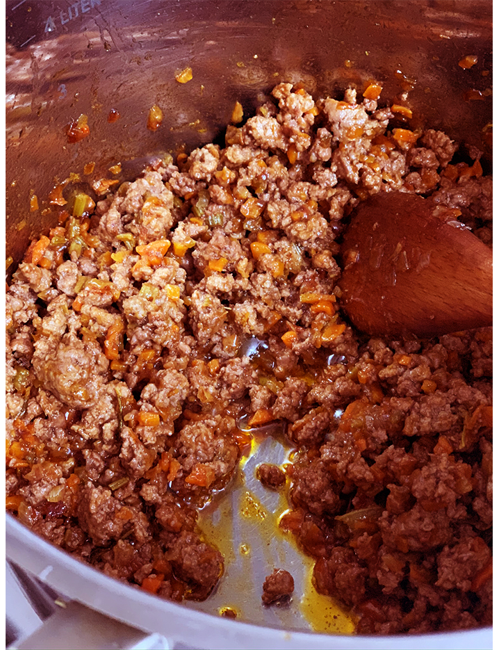 Nel frattempo che il nostro soffitto sta sudando lentamente, in un’altra padella a fiamma bassa rosoliamo la carne macinata, con un leggerissimo filo d’olio e senza aggiungere sale mi raccomando. La carne e le verdure rosolano con modi e tempi diversi. La prima ha bisogno di fiamma viva, le seconde di appassire dolcemente. Quando la nostra carne e’ pronta, la aggiungiamo al nostro soffritto e lasciamo ‘mischiare’ i sapori per un paio di minuti.