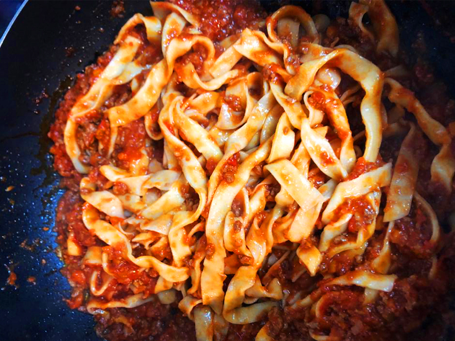 After the time has passed remove ragu from the heat. Chill uncovered until cold, then cover and keep chilled. Rewarm before continuing and serve over cooked pasta. I like to serve my Bolognese with some fresh HOMEMADE TAGLIATELLE. Enjoy! 🙂