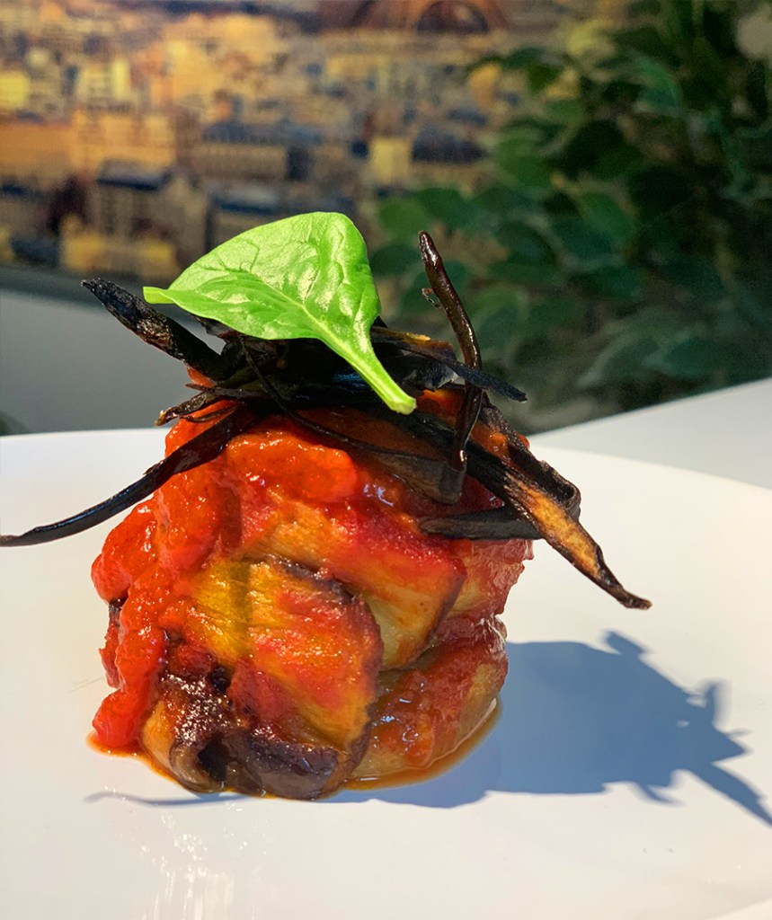 We thought to give this classic dish a slightly modern shape by using the cling wrap, with which we rolled the eggplants and the rest of the ingredients on themselves in order to create a sort of “salami” which we then frozen, cut and regenerated in the oven with the remaining tomato sauce and decorated with the fried eggplant peel. Few and elementary flavors that combine perfectly, simplicity that gives life to a masterpiece!