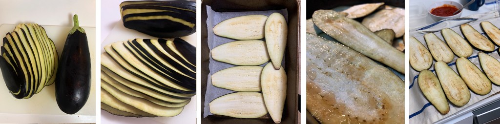 Prepare one dish with the potato starch. Take an eggplant slice and coat in the flour (shake excess flour). Set on a large tray for now. Repeat with the rest of the eggplant. In a large pan, I start heating the oil and as soon as 170 degrees, add eggplant and fry for 2 to 4 minutes on each side or until nicely golden, work in batches and do not crowd the skillet. Set fried eggplant on paper towels to drain to remove any excess oil. Preheat the oven to 180C degrees, 350F.