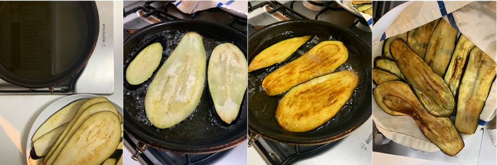 I chose olive oil to fry because the result I want has to be very tasty (if you don’t have it, you could use the sunflower oil). The first thing to do is to make the eggplants lose their slightly bitter taste: cut them lengthwise into thin strips and lay eggplant slices on a large baking sheet lined with paper towel. Sprinkle with salt and set aside to let the eggplant “sweat out its bitterness.” About 30 minutes or so. Then pat dry.