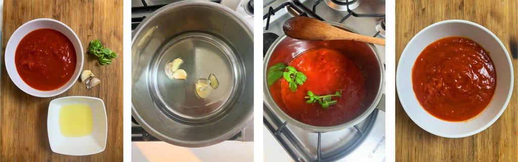 Passo alla preparazione del sugo. Soffriggo l’aglio con dell’olio, aggiungo la passata, aggiusto di sale e aggiungo basilico, tanto basilico e lascio cuocere per almeno 40 minuti.