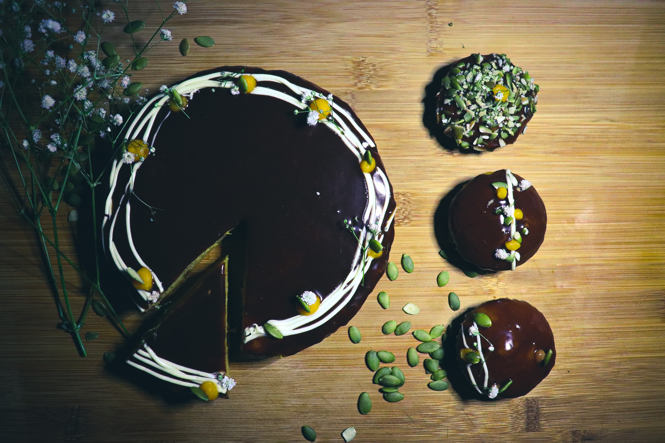 For the chocolate ganache, the method I use is to melt the chocolate in a double boiler also called Bain Marie or water bath. If you don’t have a double boiler use a saucepan and a metallic bowl which fits on top of the pot. Add about 1 – 2 cm water in the pot and add the bowl with the chocolate on top. Bring to boil, reduce heat and stir chocolate until it melts. Add the remaining ingredients, glucose and pumpkin puree as per recipe and mix it untill well combined. Pour the chocolate-pumpkin ganache on the cake and glaze it. Finish the cake with icing sugar, pumpkin seeds and some vegan white chocolate using your imagination 🙂