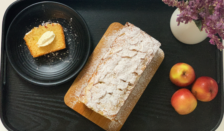 I love to match the apple cake with sour cream and a cup of green tea.
