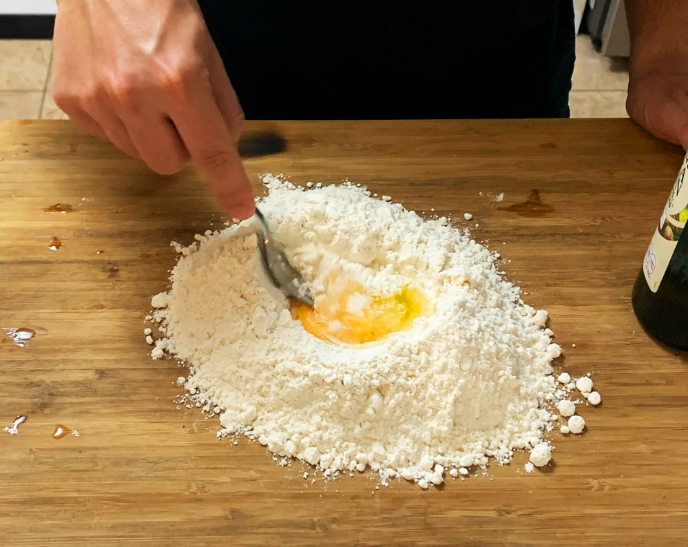 Il modo più semplice ed efficace per fare la pasta è alla vecchia maniera. Cosi’ facciamo in Italia da generazioni! Hai bisogno soltanto di una superficie e una forchetta. Disponi la farina su una spianatoia o su piano rigido e fermo e con le mani pratichi un buco al centro, come se fosse il cratere di un vulcano. Aggiungi le uova, il sale, l’olio d’oliva e l’acqua, e continua a mescolare fino a quando l’impasto sara’ omogeneo e compatto.